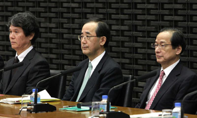 日本央行行長白川方明(中)15日在分行行長季度會議上說,央行將通過維持利率零水平以及穩(wěn)步擴(kuò)大資產(chǎn)購買計劃,來持續(xù)放松銀根。他表示,盡快克服通縮對于日本經(jīng)濟(jì)至關(guān)重要。