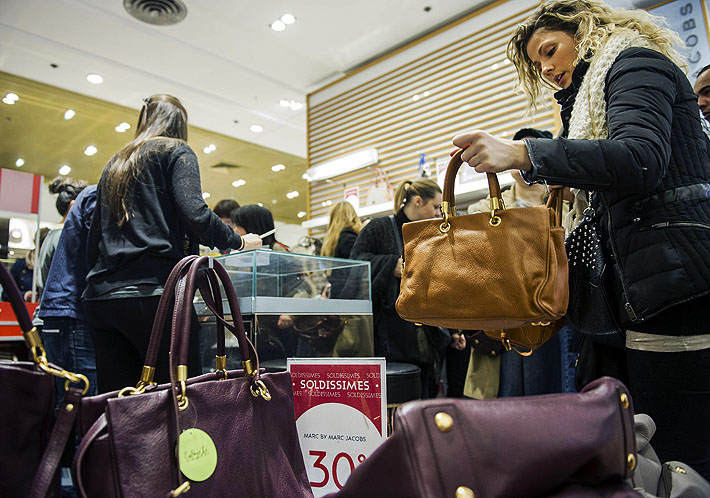 人們?cè)诜▏?guó)巴黎老佛爺百貨搶購(gòu)打折商品。新華社發(fā)(埃蒂安·洛朗 攝) |