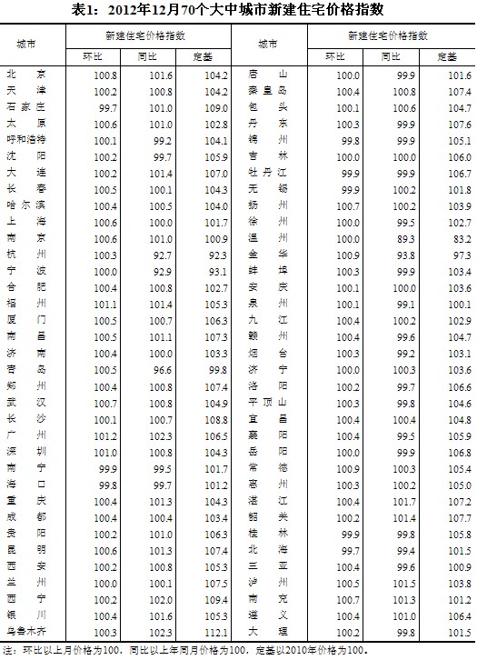 (二)與上年同月相比,70個(gè)大中城市中,價(jià)格下降的城市有26個(gè),持平的城市有4個(gè),上漲的城市有40個(gè)。12月份,同比價(jià)格上漲的城市中,漲幅均未超過(guò)2.4%,漲幅比11月份回落的城市有1個(gè)。