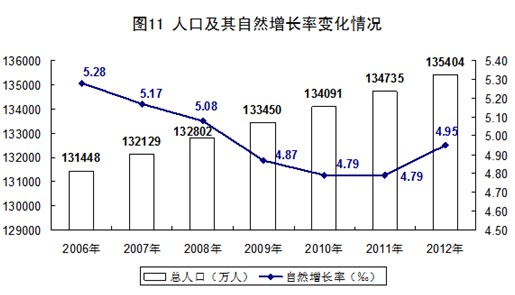 2012年末,中國大陸總人口(包括31個省、自治區(qū)、直轄市和中國人民解放軍現(xiàn)役軍人,不包括香港、澳門特別行政區(qū)和臺灣省以及海外華僑人數(shù))135404萬人,比上年末增加669萬人。出生人口1635萬人,人口出生率為12.10‰,比上年提高0.17個千分點;死亡人口966萬人,人口死亡率為7.15‰,比上年提高0.01個千分點;人口自然增長率為4.95‰,比上年提高0.16個千分點。從性別結構看,男性人口69395萬人,女性人口66009萬人;總人口性別比為105.13(以女性為100,男性對女性的比例),比上年末下降0.05;出生人口性別比為117.70,比上年末下降0.08。從年齡構成看,60歲及以上人口19390萬人,占總人口的14.3%,比上年末提高0.59個百分點;65歲及以上人口12714萬人,占總人口的9.4%,比上年末提高0.27個百分點;15-59歲勞動年齡人口93727萬人,比上年減少345萬人,占總人口的比重為69.2%,比上年末下降0.60個百分點。從城鄉(xiāng)結構看,城鎮(zhèn)人口71182萬人,比上年末增加2103萬人;鄉(xiāng)村人口64222萬人,減少1434萬人;城鎮(zhèn)人口占總人口比重達到52.57%,比上年末提高1.30個百分點。全國居住地和戶口登記地不在同一個鄉(xiāng)鎮(zhèn)街道且離開戶口登記地半年以上的人口(即人戶分離人口)2.79億人,比上年末增加789萬人;其中流動人口為2.36億人,比上年末增加669萬人。年末全國就業(yè)人員76704萬人,比上年末增加284萬人;其中城鎮(zhèn)就業(yè)人員37102萬人,比上年末增加1188萬人。