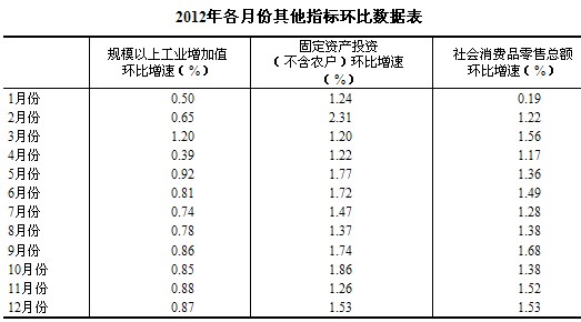 根據(jù)季節(jié)調整模型自動修正結果,對近一年各期國內生產(chǎn)總值、規(guī)模以上工業(yè)增加值、固定資產(chǎn)投資(不含農戶)、社會消費品零售總額環(huán)比增速進行修訂。修訂結果及2012年四季度GDP環(huán)比數(shù)據(jù)、2012年12月份其他指標環(huán)比數(shù)據(jù)如下: