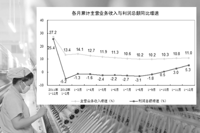 國家統(tǒng)計局27日發(fā)布,2012年全國規(guī)模以上工業(yè)企業(yè)實現(xiàn)利潤同比增長5.3%,12月當月增長17.3%。2011年12月全國規(guī)模以上工業(yè)企業(yè)實現(xiàn)利潤同比增長31.5%。經(jīng)濟學家分析認為,從2012年9月份開始,我國規(guī)模以上工業(yè)企業(yè)利潤連續(xù)4個月正增長,說明從短期看企業(yè)經(jīng)營情況在好轉。