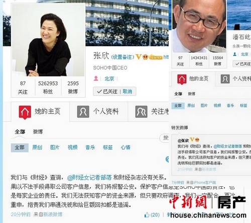 沉默了幾天的SOHO中國再次發(fā)出聲音。今天早上,SOHO中國CEO張欣在其實(shí)名微博稱,“指責(zé)我們串通洗錢和給巨額回扣都是造謠”。同時(shí),該條微博中還提到了網(wǎng)友“財(cái)經(jīng)女記者部落”,張欣稱經(jīng)查詢“財(cái)經(jīng)女記者部落”與財(cái)經(jīng)雜志無關(guān),并大力支持反腐,“但如果以不法手段取得公司客戶信息,我們將報(bào)警公安!