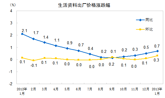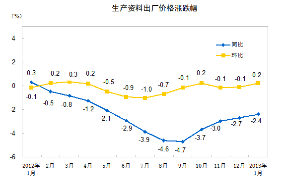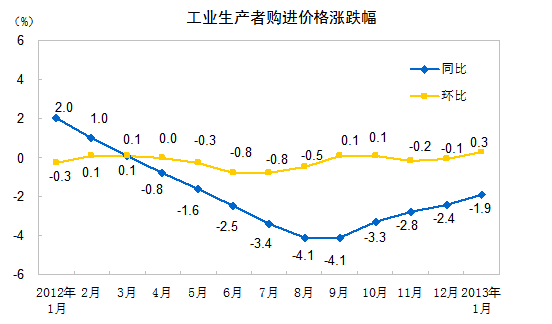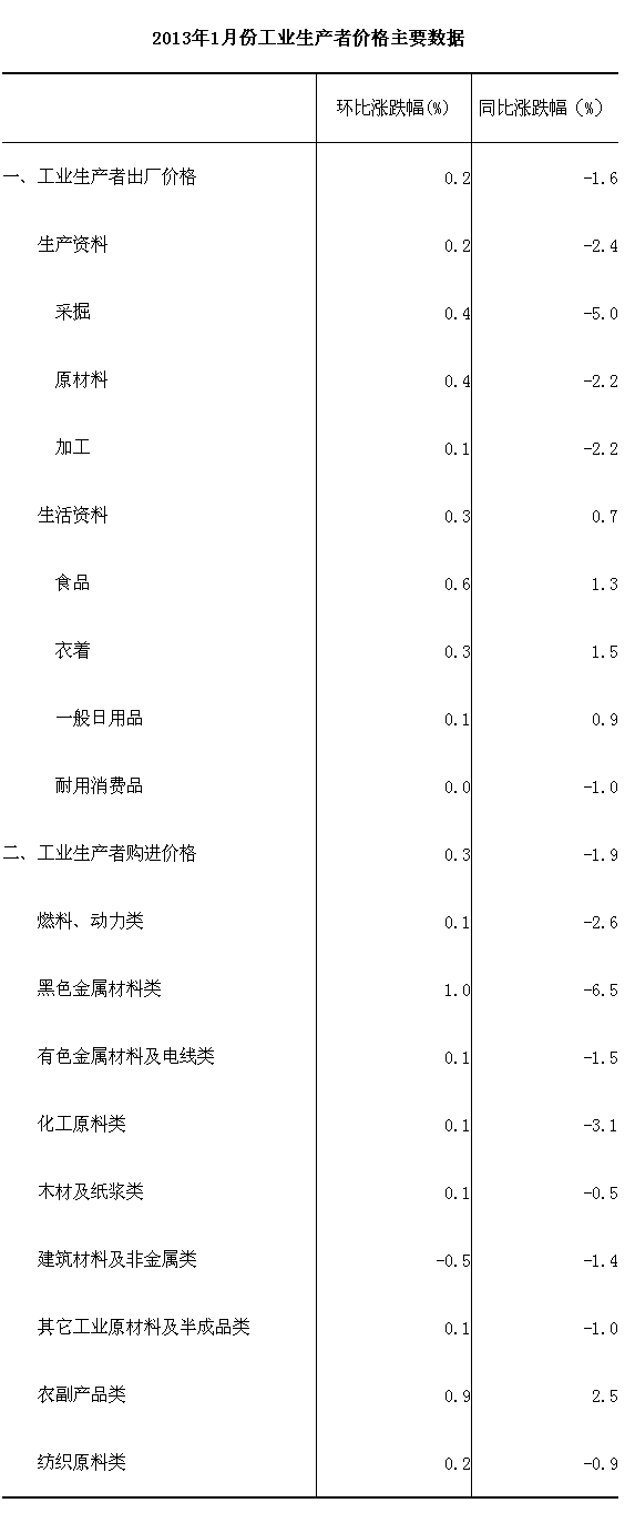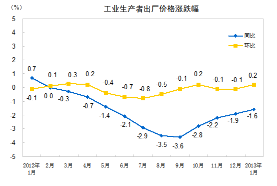 2013年1月份,全國工業(yè)生產者出廠價格同比下降1.6%,環(huán)比上漲0.2%。工業(yè)生產者購進價格同比下降1.9%,環(huán)比上漲0.3%。