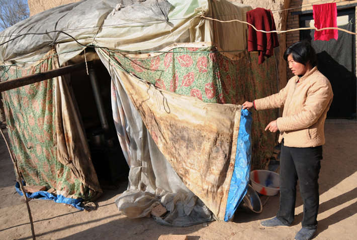 由于擔心危窯坍塌,常小萍和丈夫在院子里用塑料、破布搭了一大一小兩頂簡易帳篷,在慶陽市政府除夕發(fā)放救災(zāi)帳篷之前,常小萍夫婦已經(jīng)在里面住了一個多月。