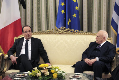法國(guó)總統(tǒng)奧朗德19日出訪希臘,在雅典與希臘總統(tǒng)卡羅洛斯·帕普利亞斯舉行會(huì)談。奧朗德表示,單純依靠緊縮措施,財(cái)政改革無法取得成功。他認(rèn)為,確保經(jīng)濟(jì)恢復(fù)增長(zhǎng)應(yīng)是歐洲國(guó)家的優(yōu)先議程。