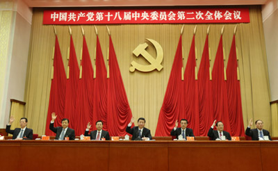 中國共產(chǎn)黨第十八屆中央委員會第二次全體會議,于2013年2月26日至28日在北京舉行。這是習(xí)近平、李克強、張德江、俞正聲、劉云山、王岐山、張高麗等在主席臺上。