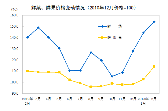 2013年2月份,全國居民消費(fèi)價格總水平同比上漲3.2%。其中,城市上漲3.2%,農(nóng)村上漲3.3%;食品價格上漲6.0%,非食品價格上漲1.9%;消費(fèi)品價格上漲3.3%,服務(wù)價格上漲3.1%。