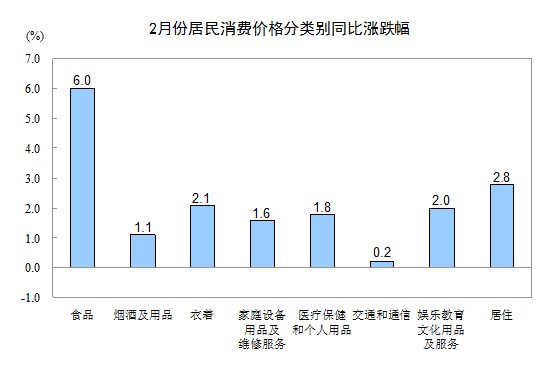 2月份,全國居民消費(fèi)價格總水平環(huán)比上漲1.1%。其中,城市上漲1.1%,農(nóng)村上漲1.0%;食品價格上漲2.7%,非食品價格上漲0.2%;消費(fèi)品價格上漲1.2%,服務(wù)價格上漲0.8%。