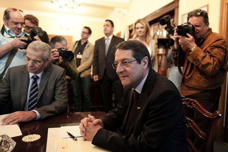 3月20日,在塞浦路斯首都尼科西亞,塞浦路斯總統(tǒng)尼科斯·阿納斯塔夏季斯(前右)和勞動人民進步黨總書記基普里亞努(前左)與各黨派領(lǐng)導(dǎo)人及塞浦路斯中央銀行行長會面,討論走出危機的辦法。