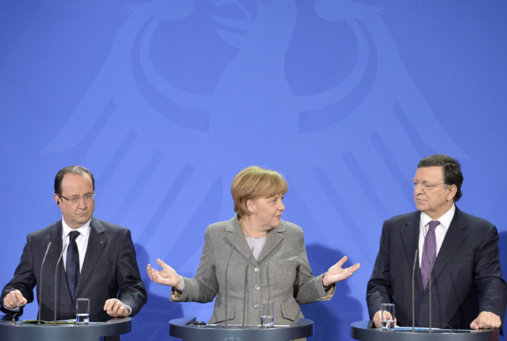 3月18日,法國(guó)總統(tǒng)奧朗德(左)、德國(guó)總理默克爾(中)和歐盟委員會(huì)主席巴羅佐在德國(guó)柏林出席歐洲工業(yè)家圓桌會(huì)議。新華社/法新