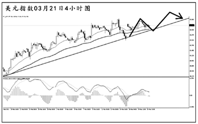 美元指數(shù)此前的下跌已經(jīng)將道氏低點(diǎn)82.30跌破,但在調(diào)整之后仍延續(xù)著自身的漲勢。4小時圖發(fā)生了持續(xù)的MACD頂背離信號,但是由于上升趨勢線的依托作用完好,美元指數(shù)仍有進(jìn)一步?jīng)_高的動力。短線價格的上行力度明顯減弱,目前需要繼續(xù)關(guān)注趨勢線支撐,只要美元指數(shù)不站穩(wěn)在82.40下方,后市仍將以走高為主。 |