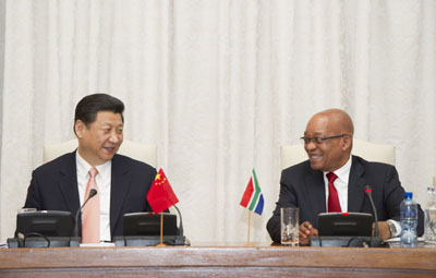國家主席習(xí)近平26日在比勒陀利亞同南非總統(tǒng)祖馬舉行會談。習(xí)近平指出,中國支持南非辦好金磚國家領(lǐng)導(dǎo)人第五次會晤以及金磚國家同非洲國家領(lǐng)導(dǎo)人對話會,愿同南方一道,加強(qiáng)金磚國家合作,推動金磚國家加強(qiáng)對非合作。