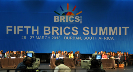 3月27日,金磚國家領(lǐng)導(dǎo)人第五次會晤在南非德班舉行。中國國家主席習(xí)近平和巴西、俄羅斯、印度、南非領(lǐng)導(dǎo)人出席會晤。這次會晤的主題為“金磚國家與非洲:致力于發(fā)展、一體化和工業(yè)化的伙伴關(guān)系”。