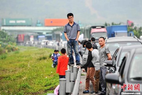 4月3日,深汕高速廣東海豐縣鲘門鎮(zhèn)至陸豐縣一段因交通事故和車流密集等原因造成長達(dá)數(shù)十公里的擁堵,高速公路儼然“變身”停車場。不少車主停車占用應(yīng)急車道。圖為汽車乘客下車休息。洪堅(jiān)鵬