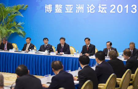 4月8日,國家主席習近平在海南省博鰲同出席博鰲亞洲論壇2013年年會的中外企業(yè)家代表座談。 習近平強調(diào),中國經(jīng)濟發(fā)展前景廣闊,中國將堅定不移推進改革開放,加快轉(zhuǎn)變發(fā)展方式,堅定不移奉行對外開放政策,繼續(xù)為外國企業(yè)提供更好的環(huán)境和條件,中國的發(fā)展將為世界作出更大貢獻。