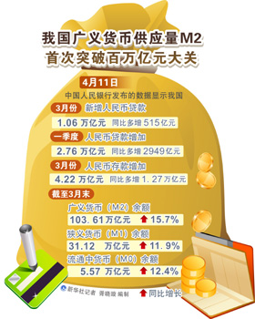 央行11日公布的數(shù)據(jù)顯示,3月末,廣義貨幣(M2)余額103.61萬億元,同比增長15.7%,分別比上月末和上年末高0.5個(gè)和1.9個(gè)百分點(diǎn);狹義貨幣(M1)余額31.12萬億元,同比增長11.9%,分別比上月末和上年末高2.4個(gè)和5.4個(gè)百分點(diǎn);流通中貨幣(M0)余額5.57萬億元,同比增長12.4%。一季度凈投放現(xiàn)金1065億元。
