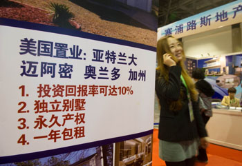 為期四天的2013年北京春季房地產(chǎn)展示交易會日前在北京展覽館開幕。本次房展共集結(jié)國內(nèi)外項目五百余個。圖為一名參觀者從北京春季房展會上一處海外購房移民的展示牌前走過。記者