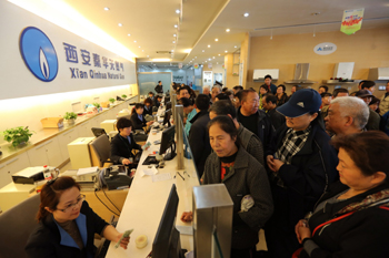 西安市秦華天然氣南二環(huán)營業(yè)廳內(nèi)擠滿了前來搶購天然氣的市民。記者 李一博/攝 |