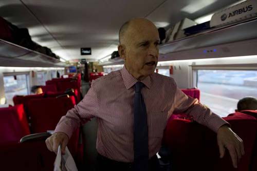 杰瑞-布朗率領(lǐng)的代表團(tuán)上周四晚間還乘坐了北京南站開往上海的高鐵,5個(gè)小時(shí)的旅程給代表們留下了深刻印象。北京到上海的高鐵全長750英里大約相當(dāng)于從圣迭哥到俄勒岡的距離。杰瑞-布朗在高鐵動(dòng)車上發(fā)表了即興講話,并與同車的中國旅客握手交談。
