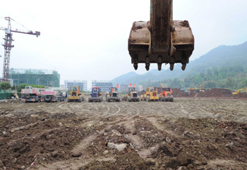 4月22日,蘆山地震抗震救災工作進入第三天,中鐵二局、安徽水利等單位的工程車在蘆山縣城平整土地,為災民搭建臨時居住板房做準備。新華社記者