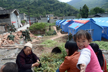 四川省蘆山“4·20”7.0級強(qiáng)烈地震災(zāi)后第六日,災(zāi)區(qū)各個鄉(xiāng)鎮(zhèn)的生活逐漸恢復(fù)平靜,商店開門營業(yè),村民們打出了感恩標(biāo)語,小孩子在公路上玩!