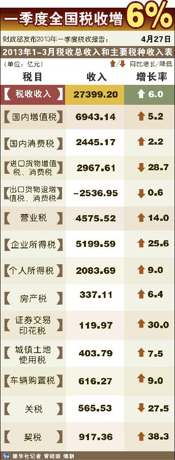 財(cái)政部27日發(fā)布2013年一季度稅收?qǐng)?bào)告顯示,今年前三個(gè)月全國(guó)稅收總收入完成27399.20億元,比去年同期增長(zhǎng)6%,增速回落了4.3個(gè)百分點(diǎn),其中部分主體稅種出現(xiàn)負(fù)增長(zhǎng),而房地產(chǎn)相關(guān)稅收收入則出現(xiàn)反彈。