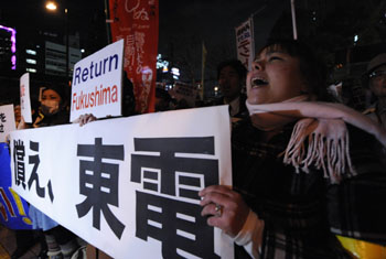 3月11日,在日本東京的東京電力公司總部前,游行者手持標(biāo)語、呼喊口號進(jìn)行抗議核電站的游行。游行者呼吁東電向福島市民賠償,并反對重啟核電站。新華社發(fā)(關(guān)賢一郎