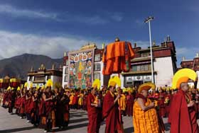 屆時,巨型強(qiáng)巴佛唐卡將在壇城大殿前徐徐展開,接受虔誠的信眾拋獻(xiàn)哈達(dá)。當(dāng)法號齊鳴、法鑼合奏,上千名身著嶄新僧袍的僧人列隊走出措欽大殿,徑直走向寺廟中央的空地,集體誦經(jīng)祈福。