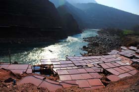 如今,鹽井的鹽業(yè)生產(chǎn)仍保持著原始人工生產(chǎn)方式,鹽民在江兩岸層層疊疊建起幾千塊鹽田,每塊鹽田面積大約有六至八平方米,每次灌滿鹵水,每塊鹽田三兩天就可收獲二十多斤鹽結(jié)晶。