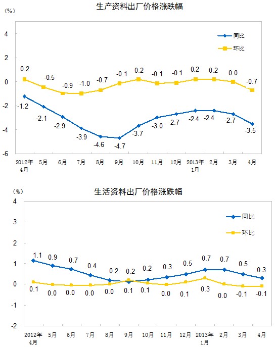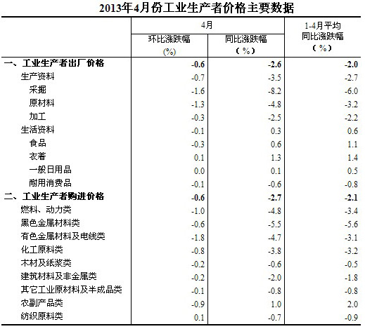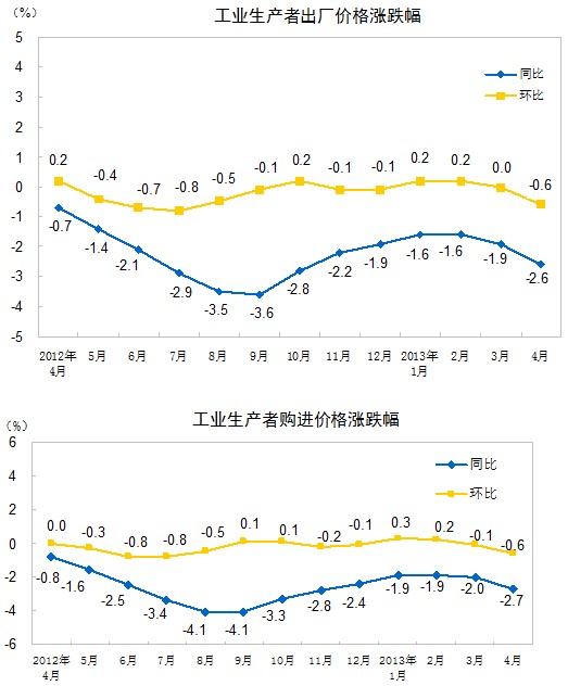 2013年4月份,全國(guó)工業(yè)生產(chǎn)者出廠價(jià)格同比下降2.6%,環(huán)比下降0.6%。工業(yè)生產(chǎn)者購(gòu)進(jìn)價(jià)格同比下降2.7%,環(huán)比下降0.6%。1-4月平均,工業(yè)生產(chǎn)者出廠價(jià)格同比下降2.0%,工業(yè)生產(chǎn)者購(gòu)進(jìn)價(jià)格同比下降2.1%。