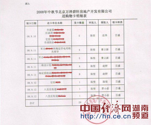 在2008年中秋節(jié)萬澤地產(chǎn)分公司即北京萬澤碧軒房地產(chǎn)開發(fā)有限公司贈送購物卡明細表里可以清晰的看到,9月10日,贈送市建委沈處、區(qū)政府王秘書、張秘書、交管局王局長等共4張;9月11日,贈送海淀質(zhì)檢站閻站長、曲站長、劉某某、董某、趙某某等共8張;9月12日,贈送八里莊街道王副主任、八里莊街道楊科長等共3張……