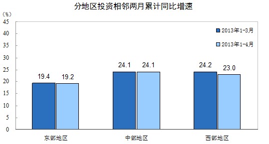 分地區(qū)看,1-4月份,東部地區(qū)投資46113億元,同比增長(zhǎng)19.2%,增速比1-3月份回落0.2個(gè)百分點(diǎn);中部地區(qū)投資23537億元,增長(zhǎng)24.1%,增速與上月持平;西部地區(qū)投資21046億元,增長(zhǎng)23%,增速回落1.2個(gè)百分點(diǎn)。