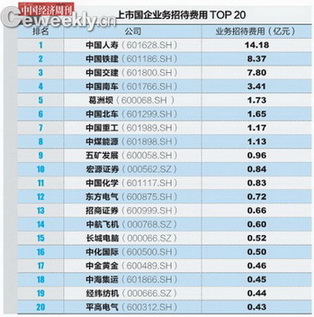 據(jù)港澳資訊統(tǒng)計(jì)的數(shù)據(jù)顯示,252家?guī)А皣?guó)有”背景的上市企業(yè),2012年年報(bào)中公開(kāi)披露的業(yè)務(wù)招待費(fèi)一項(xiàng),總計(jì)65.25億元。業(yè)務(wù)招待費(fèi)前20位的上市國(guó)企為:中國(guó)人壽、中國(guó)鐵建、中國(guó)交建、中國(guó)南車、葛洲壩、中國(guó)北車、中國(guó)重工、中煤能源、五礦發(fā)展、宏源證券、中國(guó)化學(xué)、東方電氣、招商證券、中航飛機(jī)、長(zhǎng)城電腦、中化國(guó)際、中金黃金、中海集運(yùn)、經(jīng)緯紡機(jī)、平高電氣。中國(guó)人壽業(yè)務(wù)招待費(fèi)最多,達(dá)14.18億元。