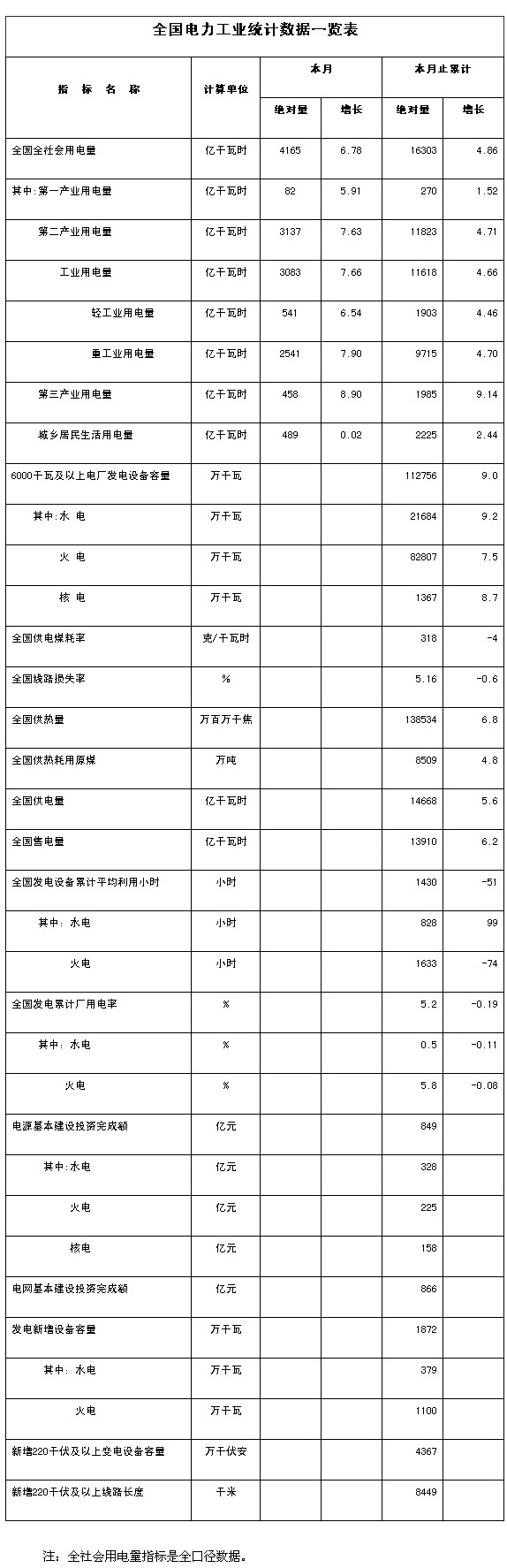 附:全國(guó)電力工業(yè)統(tǒng)計(jì)數(shù)據(jù)