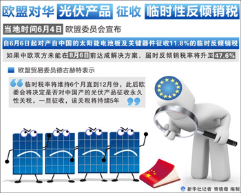 一石激起千層浪。歐盟委員會(huì)4日宣布,歐盟將從6月6日起對(duì)產(chǎn)自中國的光伏產(chǎn)品征收11.8%的臨時(shí)反傾銷稅,如果雙方未能在8月6日前達(dá)成妥協(xié)方案,屆時(shí)反傾銷稅率將升至47.6%。歐委會(huì)不顧多方反對(duì),執(zhí)意對(duì)華光伏征稅,這在中國和歐盟引發(fā)了強(qiáng)烈的反對(duì)浪潮。