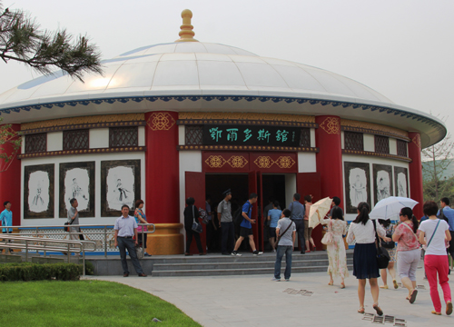鄂爾多斯展園位于園博園西南側(cè),總占地面積8400平方米,面對北京主展館,臨近上海園、合肥園和唐山園,是位置最突出、面積最大、內(nèi)容最豐富的展園之一。展園以蒙元文化和草原文化為基調(diào),突出鄂爾多斯特有的地域性、民族性和多元性,整體布局充分利用原有地勢,結(jié)合周邊場館環(huán)境,形成大開大合、高低錯落、疏朗有致的園林風(fēng)格。展園植物選擇鄉(xiāng)土樹種二十八種,主要包括家榆、旱柳、紅柳、沙柳、沙棗、沙地柏、檸條、馬藺等,都是耐旱、耐寒、耐瘠薄的優(yōu)選植物。園內(nèi)主體建筑由一個鋼結(jié)構(gòu)蒙古包、一個氈包和一個原生態(tài)敖包組成,三個圓形建筑各具特色,相互呼應(yīng),以開放熱情的姿態(tài)迎接四面八方來客。主館鄂爾多斯館建筑面積320平米,外立面藍(lán)白相間、雕欞映襯,館內(nèi)展陳結(jié)合、聲光互補(bǔ),集中展示鄂爾多斯城市園林綠化建設(shè)成果和經(jīng)濟(jì)社會文化各項(xiàng)事業(yè)發(fā)展成就。