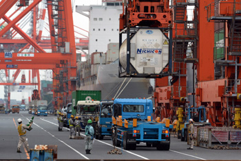 受日元貶值等因素影響,今年5月份日本貿(mào)易收支出現(xiàn)9939億日元(約合104億美元)逆差,是1979年有可比統(tǒng)計以來5月份最大貿(mào)易赤字額。 日本財務省19日公布的貿(mào)易統(tǒng)計速報值顯示,5月份日本出口額為5.7676萬億日元,同比增10.1%;進口額為6.7616萬億日元,同比增10%。 圖為6月19日,在日本東京國際貨運碼頭,集裝箱被從貨輪上卸下。