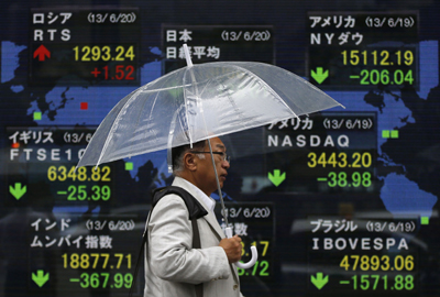 圖為20日一名日本男子舉傘走過(guò)電子交易顯示屏。