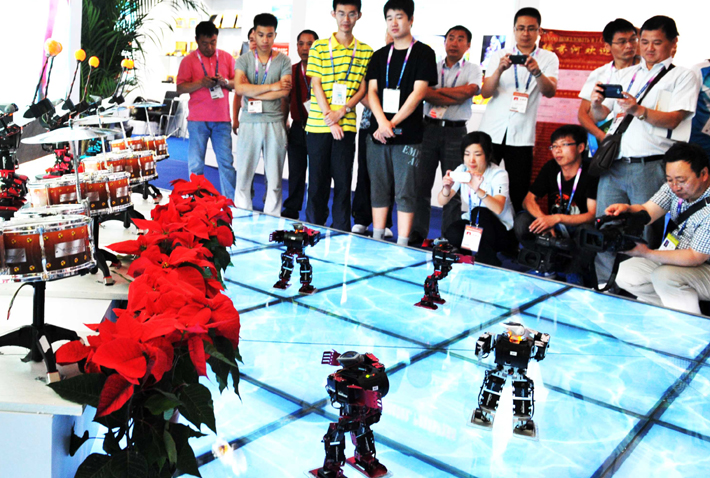第24屆中國哈爾濱國際經(jīng)濟(jì)貿(mào)易洽談會(huì)的高新技術(shù)展區(qū),機(jī)器人舞蹈吸引了參會(huì)者的眼球。哈洽會(huì)是惟一被寫入中俄兩國元首會(huì)晤聯(lián)合公告的展會(huì)。記者王建威/攝 |