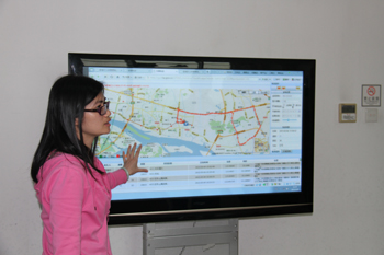 一位工作人員正在介紹GPS監(jiān)控公車情況。記者 陳冀/攝 |