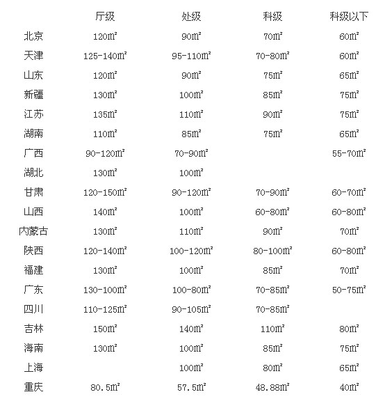 以下是全國(guó)部分省市區(qū)的干部福利住房面積一覽表: