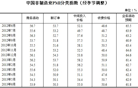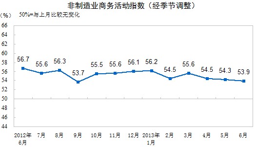 2013年6月,中國非制造業(yè)商務(wù)活動指數(shù)為53.9%,比上月回落0.4個百分點。