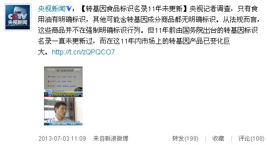 央視記者調(diào)查,只有食用油有明確標(biāo)識,其他可能含轉(zhuǎn)基因成分商品都無明確標(biāo)識。從法規(guī)而言,這些商品并不在強(qiáng)制明確標(biāo)識行列。但11年前由國務(wù)院出臺的轉(zhuǎn)基因標(biāo)識名錄一直未更新過,而在這11年內(nèi)市場上的轉(zhuǎn)基因產(chǎn)品已變化巨大。