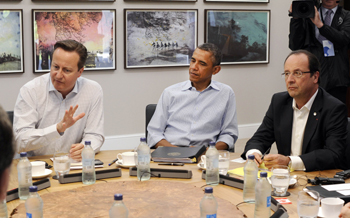 6月18日,在英國北愛爾蘭西部厄恩湖,英國首相卡梅倫(左)、美國總統(tǒng)奧巴馬(中)和法國總統(tǒng)奧朗德參加八國集團峰會工作會議。新華社/法新