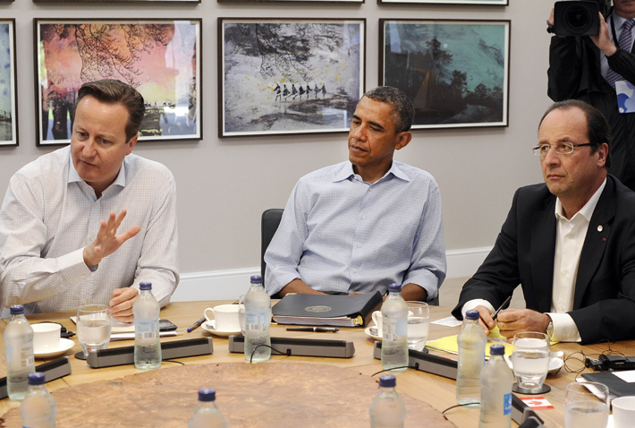 6月18日,在英國(guó)北愛(ài)爾蘭西部厄恩湖,英國(guó)首相卡梅倫(左)、美國(guó)總統(tǒng)奧巴馬(中)和法國(guó)總統(tǒng)奧朗德參加八國(guó)集團(tuán)峰會(huì)工作會(huì)議。新華社/法新 |