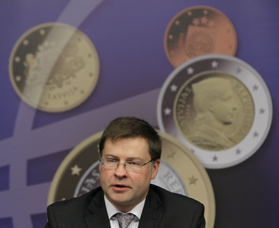 圖為拉脫維亞總理東布羅夫斯基斯當(dāng)日在比利時首都布魯塞爾的歐盟總部出席加入歐元區(qū)的新聞發(fā)布會。