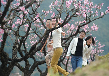 田壟上勞作的老漢跟好奇的游客攀談桃事,“夏天來我家吃桃子吧,正宗的水蜜桃,樹上養(yǎng)熟的!狈罨硕贾浪f的那種桃子:不同于為了方便運(yùn)輸在它變軟之前提早采摘下來的,而是供桃樹的主人享用而任它在樹上長到自然的果熟蒂落的。那種桃子拿在手里是軟乎乎的,看著是半透明的,里邊的果肉都化成了一包蜜水,可以找一根麥秸,戳破表皮深入到果肉中像喝飲料一樣吸……這么想著,讓人真恨不得把時間馬上拔到七八月水蜜桃成熟的季節(jié),或者直接找根吸管對著桃花去吮吸花萼深處的花蜜。