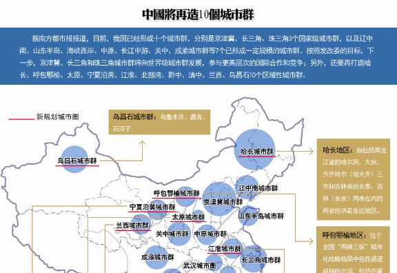 發(fā)改委對(duì)城市群的發(fā)展目標(biāo)是,下一步京津冀、長(zhǎng)江三角洲和珠江三角洲城市群將向世界級(jí)城市群發(fā)展,另外再打造哈長(zhǎng)、呼包鄂榆、太原、寧夏沿黃、江淮、北部灣、黔中、滇中、蘭西、烏昌石等10個(gè)區(qū)域性城市群,在這10個(gè)城市群中,中西部地區(qū)占據(jù)大半名額。