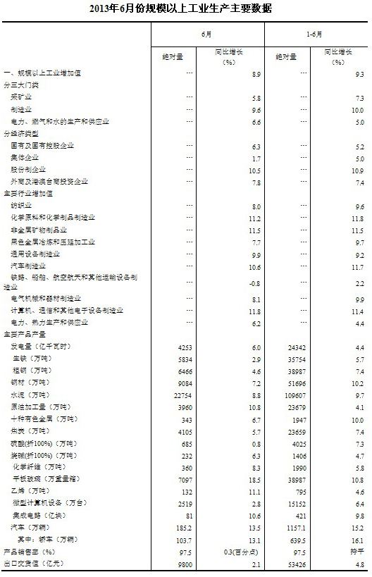 2013年6月份,規(guī)模以上工業(yè)增加值同比實(shí)際增長(zhǎng)8.9